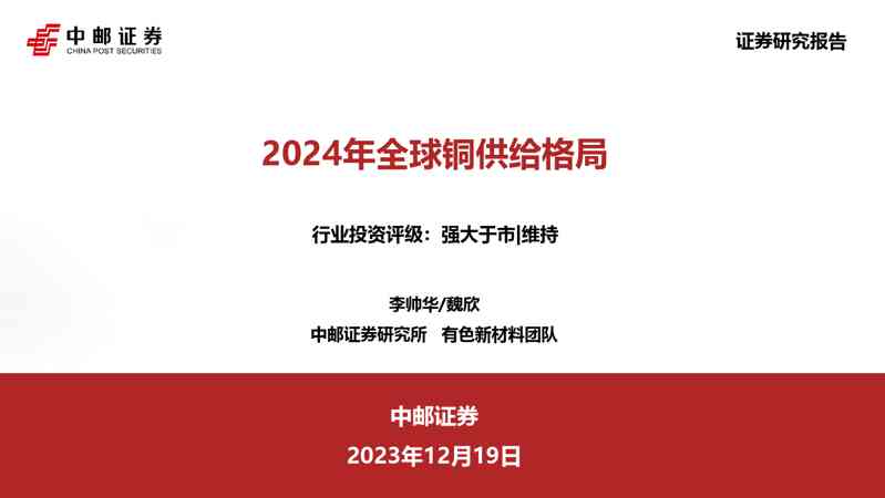 近日,国内某著名研究机构的研究报告《2024年全球铜供给格局》新鲜出炉并成功在本站发布,报告中展示的数据和观点值得我们认真研读,在此我们摘录了报告的部分内容跟小伙伴分析,详细报告可下载阅读。