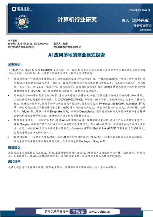 自 2022 年底 OpenAI 发布 ChatGPT 至今已逾一年,本轮 AI 革命迭代衍生的强大模型能 力也逐渐在商业化场景得到初步应用。我们认为,AI 大模型目前的商业模式大致可分为 以下四类: AI 基座模型-提供按量收费服务:提供底层模型接口的大模型厂商,一般按照 Token 计费与订阅制收费;面向 C 端主要以聊天机器人为主,面向 B、G 端开放模型接口 或提供定制化开发服务。 AI 赋能产品-带来需求与价格增长:基于公司原有产品提供 AI 功能,从而推动量与价 两方面的提升。面向 B 端以工业信息化场景为主;面向 C 端以消费电子(学习机、 AIPC)与创意软件为主;面向 G 端代表性的以满足合规审核需求为主。 AI 带来流量增长-收取广告费用:通过 AI 功能吸引形成用户客群,积累流量,并通过 广告方式将流量变现。 AI 对内赋能-帮助企业降本增效:通过 AI 赋能对公司内部进行降本增效,降本主要体 现为人效层面的改善,增效主要体现在对原有业务流程的优化。以 ChatGPT 为代表的大模型能力涌现,为基座模型厂商带来增量收入,以 OpenAI 为例, 根据 The Information 预测,其 2023 年收入约为 16 亿美元,为 2022 年收入的 8 倍。目 前国内外大模型厂商的变现方式主要有 5 种:1)根据使用量(tokens)计费,这是最常 见的计费方式;2)根据时间区间收取订阅制会员费;3)基于自身大模型技术能力,提供 模型微调服务和 API,赋能 B/C 端开发者;4)对外提供定制化服务;5)目前海内外主流 大模型主要由头部互联网厂商主导开发,可赋能其原有业务,从而间接变现。