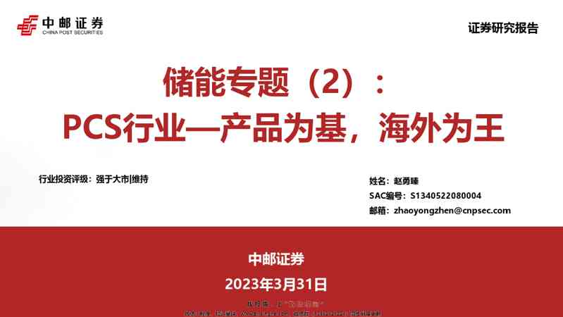 不久前,最新行业研究报告《新能源行业储能专题(2):PCS行业,产品为基,海外为王》全文正式在本站隆重发布,报告主要研究和分析了行业当前形势和发展,感兴趣的用户可以深入阅读,详细报告可下载阅读。