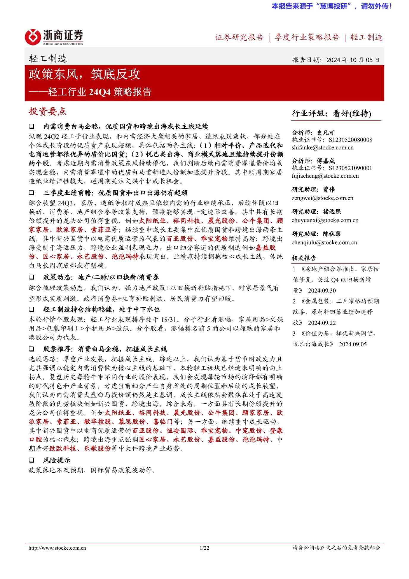 不久前,最新行业研究报告《轻工行业24Q4策略报告:政策东风,筑底反攻》全文正式在本站隆重发布,报告主要研究和分析了行业当前形势和发展,感兴趣的用户可以深入阅读,详细报告可下载阅读。