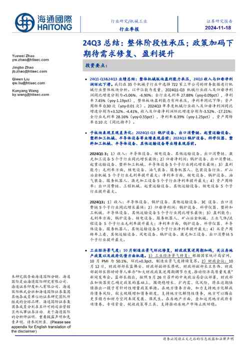 国内著名研究机构在本站发布了最新的《机械工业行业季报:24Q3总结:整体阶段性承压;政策加码下期待需求修复、盈利提升》研究报告,报告对当前行业形势提出了新的观点和看法,请跟着我们一起解读报告内容吧,详细报告可下载阅读。