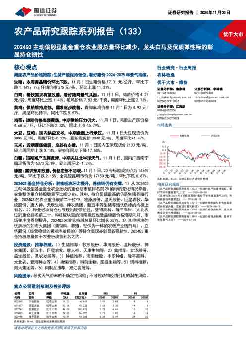 今天,《农产品研究跟踪系列报告(133):2024Q3主动偏股型基金重仓农业股总量环比减少,龙头白马及优质弹》行业研究报告在本站隆重登场,报告主要讲述了行业当前发展状况并提出了一系列的应对思路,其中很多观点值得我们深思,下面我们展示了报告的部分内容,详细报告可下载阅读。