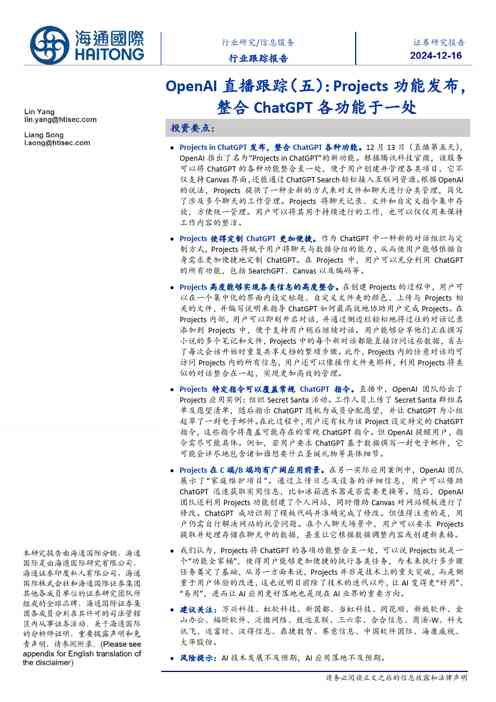 最近,国内知名研究机构在本站正式发布了《OpenAI直播跟踪(五):Projects功能发布,整合ChatGPT各功能于一处》行业研究报告,报告分析了行业的最新情况,下面就带大家一起解读一下,详细报告可下载阅读。