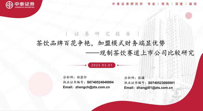 不久前,最新行业研究报告《食品饮料行业现制茶饮赛道上市公司比较研究:茶饮品牌百花争艳,加盟模式财务端显优势》全文正式在本站隆重发布,报告主要研究和分析了行业当前形势和发展,感兴趣的用户可以深入阅读,详细报告可下载阅读。