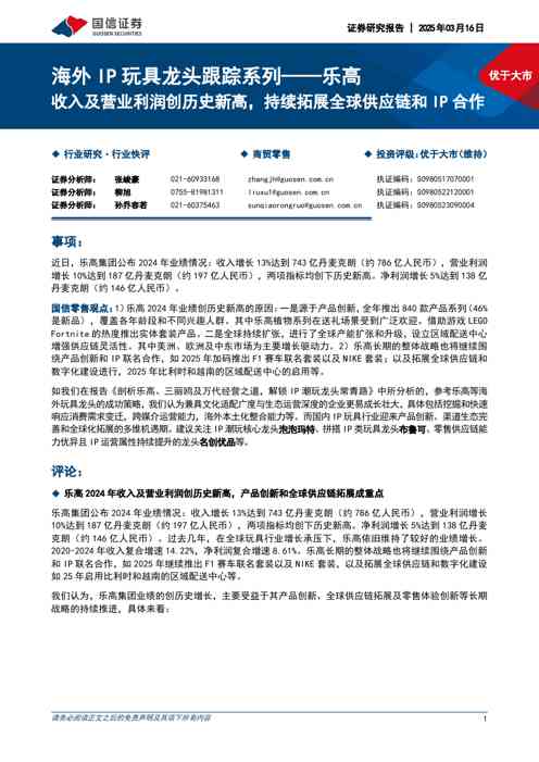 今天,《海外IP玩具龙头跟踪系列——乐高:收入及营业利润创历史新高,持续拓展全球供应链和IP合作》行业研究报告在本站隆重登场,报告主要讲述了行业当前发展状况并提出了一系列的应对思路,其中很多观点值得我们深思,下面我们展示了报告的部分内容,详细报告可下载阅读。