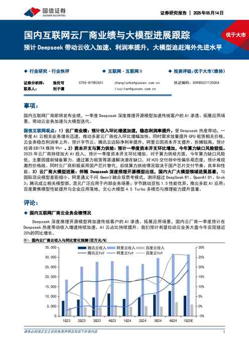 最近,国内知名研究机构在本站正式发布了《国内互联网云厂商业绩与大模型进展跟踪:预计Deepseek带动云收入加速、利润率提升,大模型追赶海外》行业研究报告,报告分析了行业的最新情况,下面就带大家一起解读一下,详细报告可下载阅读。